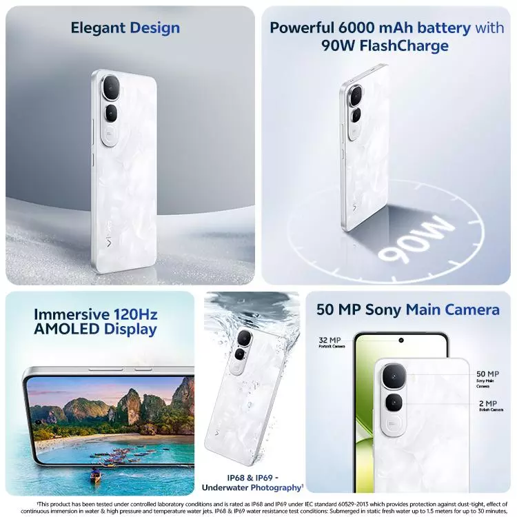 DISPLAY          Flat Display DISPLAY SIZE  6.67" Large Display FINGERPRINT  In-Display Fingerprint RESOLUTION   FHD+ (2400*1080) FRONT CAMERA         32MP ( f/2.45) REAR CAMERA "50 MP Sony IMX852 AF main camera + 2 MP Bokeh camera Rear Camera" RAM+ROM     8GB RAM + 128GB | 8GB + 256GB CPU     "Qualcomm Snapdragon® 4 Gen 2 2.2 Ghz (4nm)| Qualcomm® Adreno™ 613| AnTuTu scores 4,70,000+" OS       Funtouch OS 15 (Based on Android 15) BATTERY         6000mAh Large Battery Charger           90W Flash Charge, (Charge 50% in about 20 minutes.) WEIGHT           GLAM WHITE 198g & OLIVE GREEN 197g THICKNESS     GLAM WHITE 7.99mm & OLIVE GREEN 7.90mm PPI      395 PPI ATTRACTIVE FEATURES          IP68 & IP69 Dust and water resistance, Underwater Photography, Dual Stereo speaker, 400% Audio Buster, Hi-Res Audio, 1800 nits Local Peak Brightness, 120Hz Refresher rate, AI Features: AI Superlink, AI Note Assist, AI Circle to Search, AI Screen Translate, AI Live Text, AI Super Documents, AI Erase, AI Photo Enhance, AI Transcript Assist COLOR Glam White & Olive Green